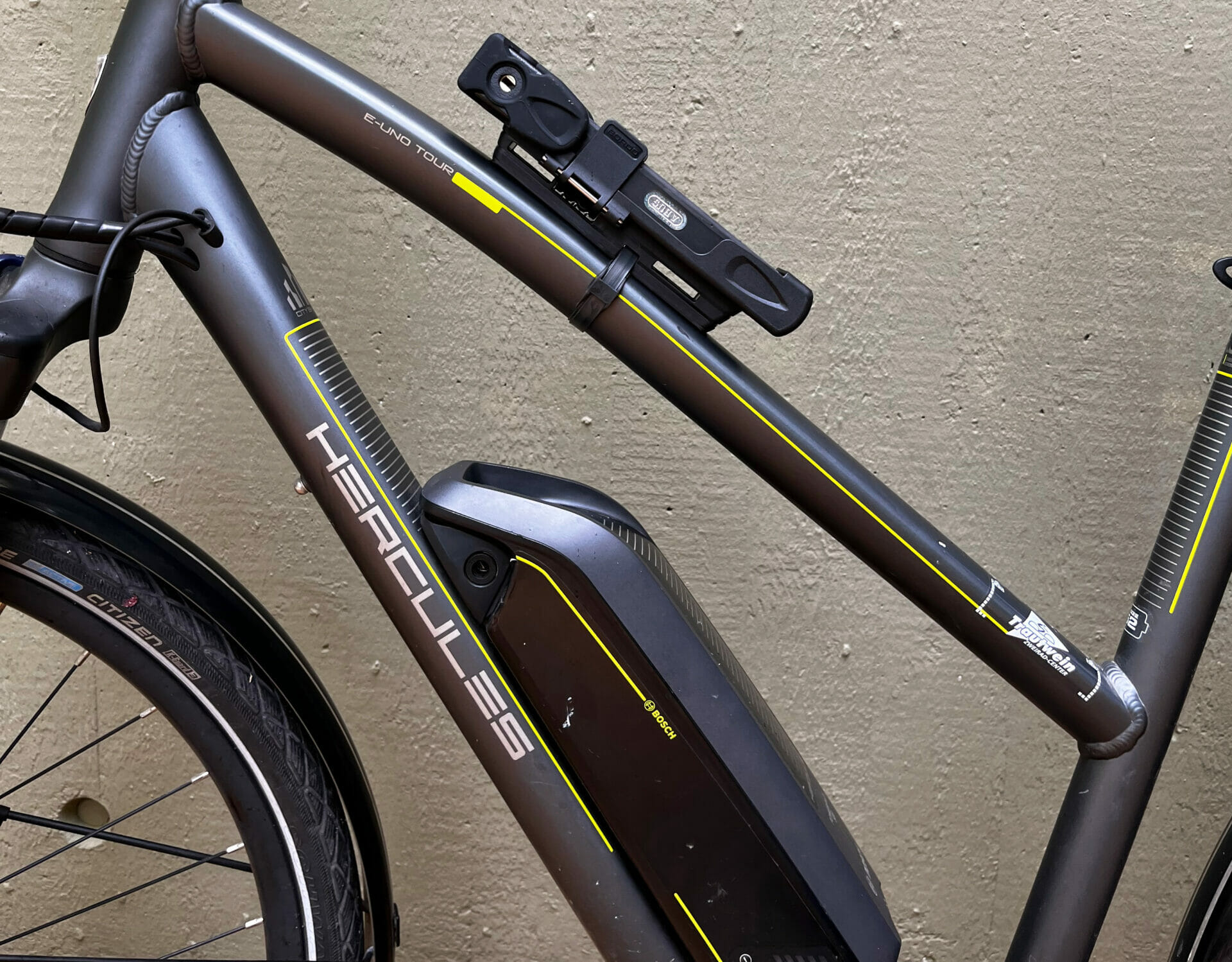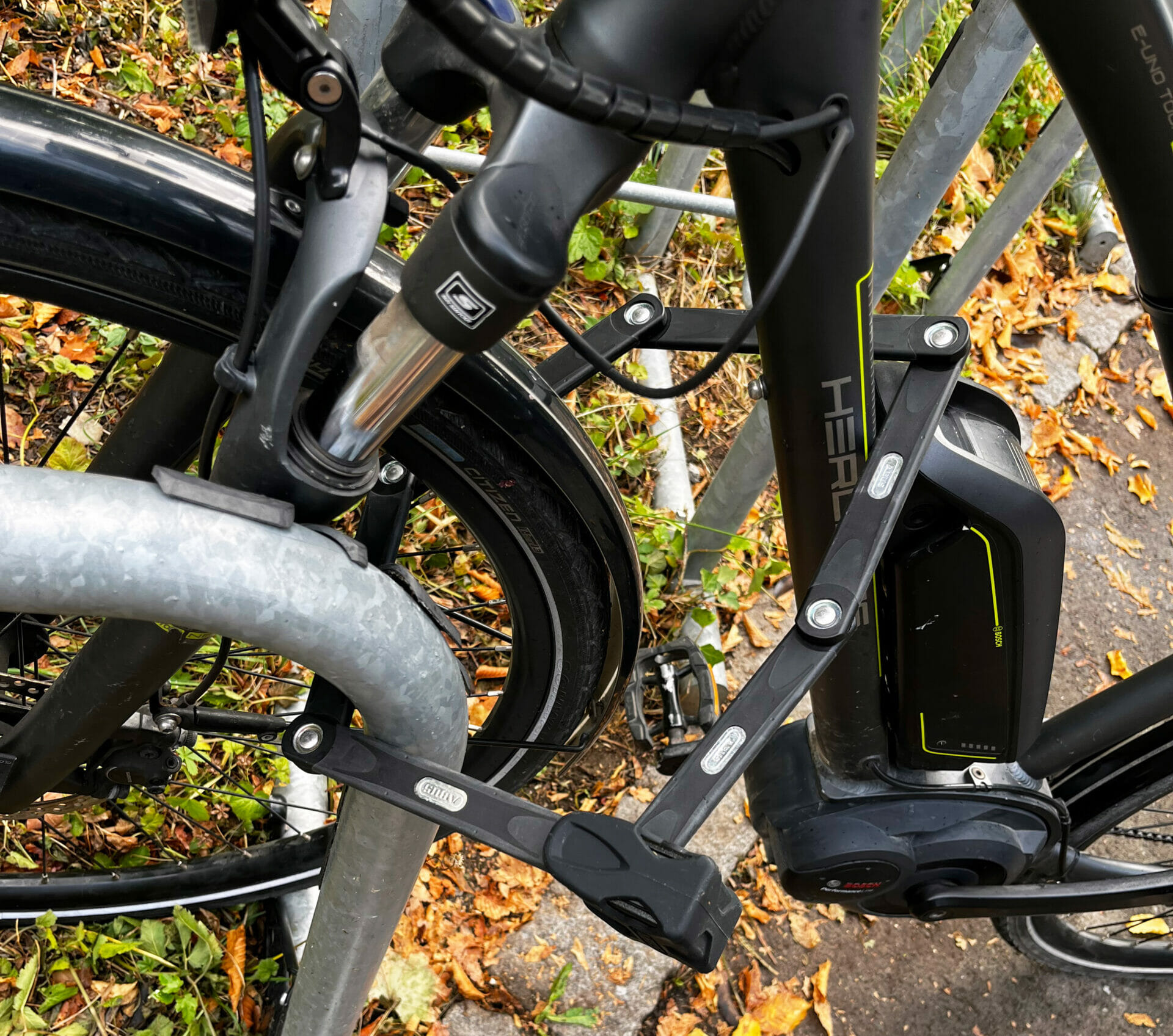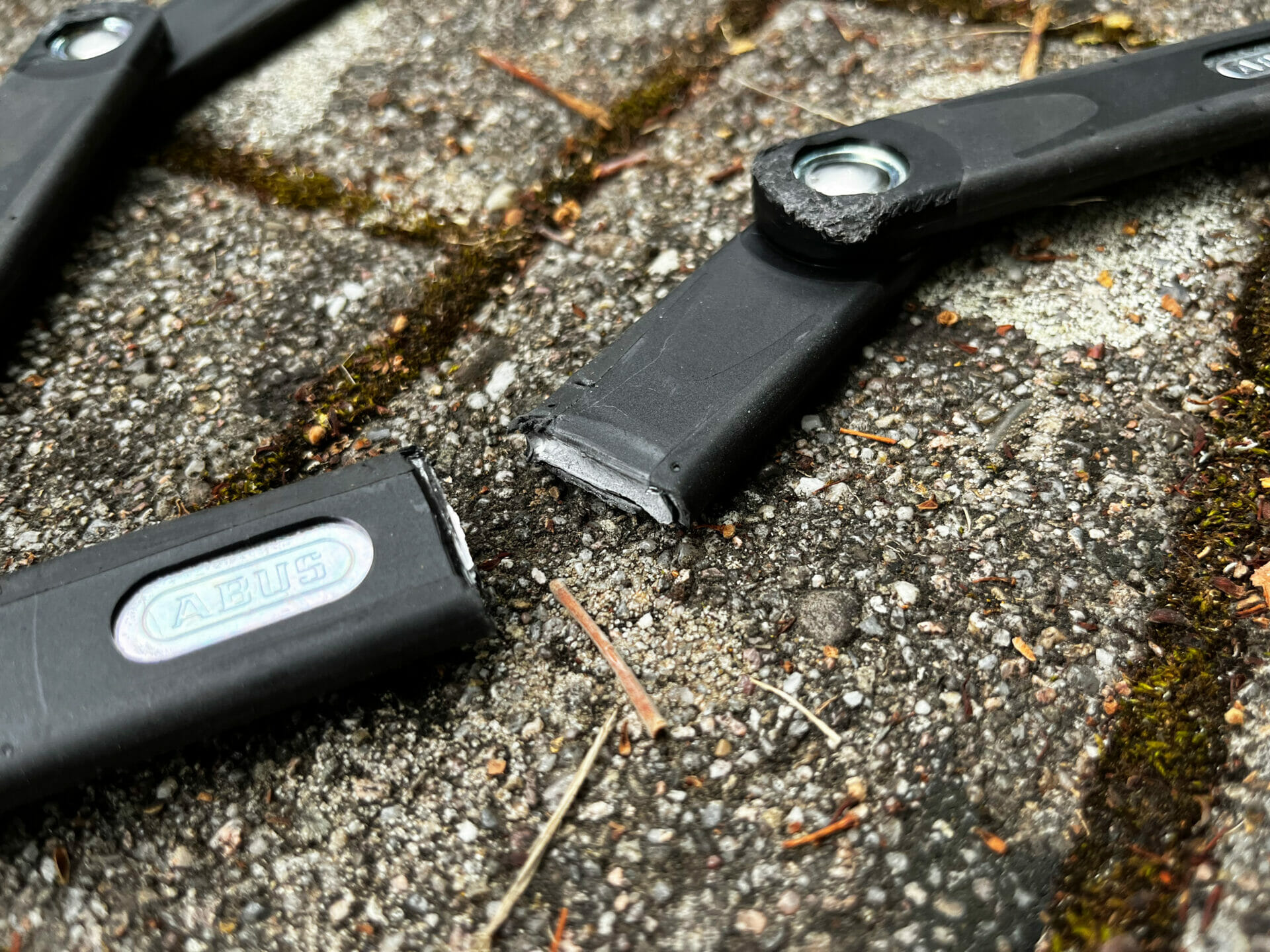 Für E-Bikes eher abzuraten, für uns überraschend war das Schloss mit dem 90 cm Bolzenschneider zu überwinden
